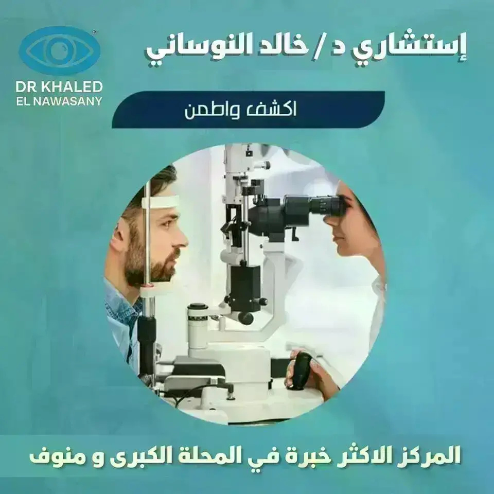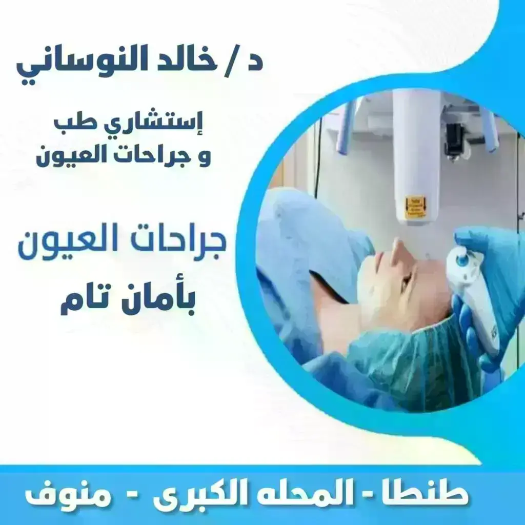 عيادات د / خالد النوساني لطب و جراحه العيون استشاري طب وجراحة العيون عضو الاكاديمية الامريكية للعيون عضو الجمعية الاوروبية للمياة البيضاء وتصحيح الابصار بعض خدمات مركز د / خالد النوساني : - عمليات المياه البيضاء بالفاكو - تصحيح الإبصار بالليزر والفمتوليزر-فمتوسمايل - علاج القرنية المخروطية و زرع الحلقات بالفيمتوليزك - علاج الاعتلال السكري بالشبكية - عمليات الحول - عمليات الجفون و الكيس الدمعي __________________ عناوين الفروع : طنطا مركز النخبة للعيون منطقة الإستاد ش الوفاء الأحد الإثنين الأربعاء من١٢-٢ظهرا 01280341000 - 01010211900 - 0403331055 --------------------------------------------- المحلة الكبرى عمارة الرجبي بجوار السنترال الجديد ٠٤٠٢٢١٧١٨٠/٠١٢٨٣٥٥٥٧٨٨ مواعيد العمل من٤-٨مساء. أيام الأحد والإثنين والأربعاء منوف ش الأشبكية بجوار مسجد الملك والسنترال أيام السبت والثلاثاء من ٢-٦مساء ٠١٢٢٥١٠٧٦٤٥