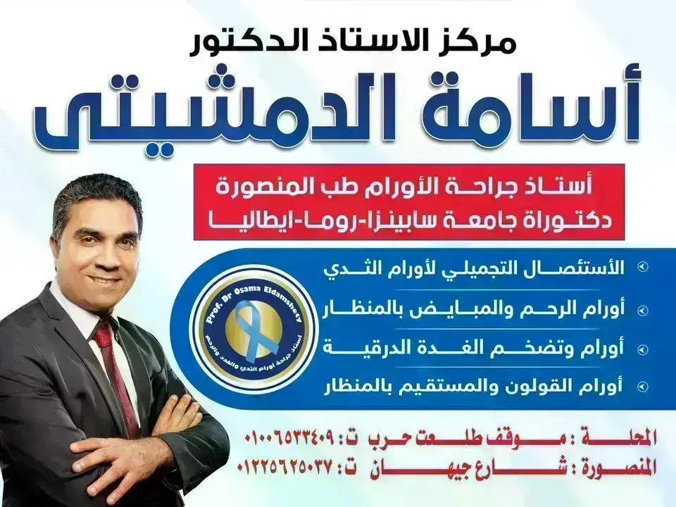 ?اكتشفتي ان عندك ورم #اطمن ➖➖➖➖➖➖➖➖➖➖➖➖➖➖➖➖ ?✅ باحدث طرق التدخل الجراحي بأمانه علميه ?و بمؤهلات حقيقيه مش وهميه? و بخبره عمليه من دول أوروبيه ?من مراكز اورام متميزه عالميا ? مش هتلاقي الجراحات المتقدمه و الدقيقه دي غير عندنا :- ?جراحات تجميل و بناء الثدي بعد استئصال اورام الثدي. ? استئصال اورم بالقولون و المستقيم بالمنظار و بدون تحويل مسار البراز ? استئصال الرحم بالمنظار و استئصال كامل لاورام المبيض ? جراحه غده درقيه أمنه و تحافظ علي صوتك ?استئصال اورام الغده النكافيه مع الحفاظ علي العصب السابع ?✅ الاهم من ده كله سلامه و أمانه القرار تدخل جراحي و لا متابعه و علاج - عشان كده بيفرق علم و خبره و شهادات الجراح - معانا هناخدك بر الأمان. ❤️ #اطمن❤️ ❤️#استاذ_الاورام❤️ ————————————————————- ?للاستفسار و الحجز بعيادات ?د. اسامه الدمشيتي? استاذ جراحه الاورام و الثدي و الغدد و الرحم بكليه طب المنصوره و مركز اورام جامعه المنصوره - يرجي الاتصال بالأرقام التاليه??:- ? المنصوره:- شارع جيهان أمام مركز الأورام برج مول الجندي الدور الثالث -ت:-٠١٢٢٥٦٢٥٠٣٧ ? المحله:- موقف طلعت حرب بجوار صيدلية ناصر- ت:-٠١٠٠٦٥٣٣٤٠٩ ???????????????? ?? #د_اسامه_الدمشيتي #dr_osama_eldamshety #جراحه_الاورام #مناظير_البطن #جراحه_الغده_الدرقيه #الغده_الجاردرقيه #تجميل_الثدي #تكبير_الثدي #تصغير_الثدي #اورام_الثدي #اورام_القولون #اورام_المستقيم #اورام_الرحم #اورام_المبيض #الغده_الدرقيه #الثدي #اورام_ليفيه #ورم_حميد #سرطان #اورام_اللسان #قرحه_اللسان #سرطان_اللسان #جراحه_الاورام #الغده_النكافيه #الغده #الغده_الدرقيه ممكن تعمل اشتراك في قناه اليوتيوب بعد اذنك https://www.youtube.com/channel/UCQY6rCwkzIN3dbrG96ntcKQ https://www.facebook.com/Dr.Osama.Eldamshety